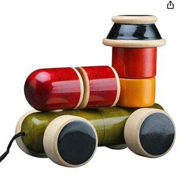 This wooden handmade assembling stacker is a pull along toy. The body is made up of different pieces that are easy to hold for children. This toy helps refine the child's eye - hand coordination and is an excellent play-toy for children right through their crawling and walking stages.